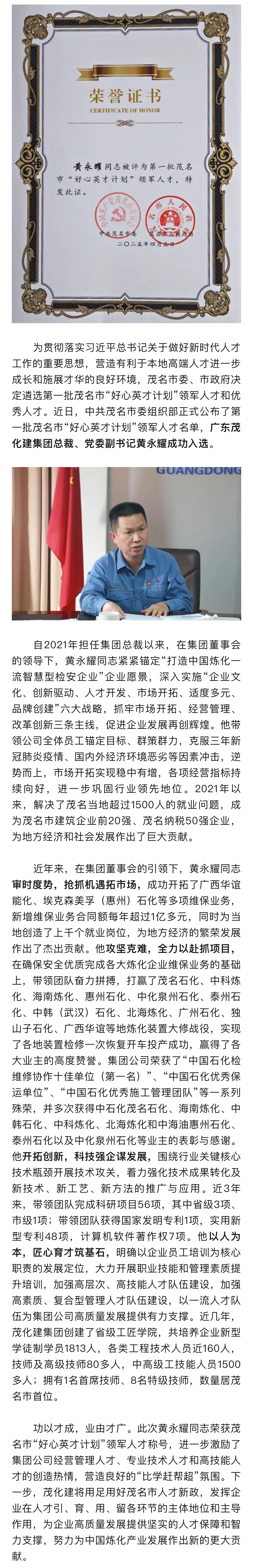 祝賀!廣東茂化建集團(tuán)黃永耀同志被評(píng)為第一批茂名市“好心英才計(jì)劃”領(lǐng)軍人才