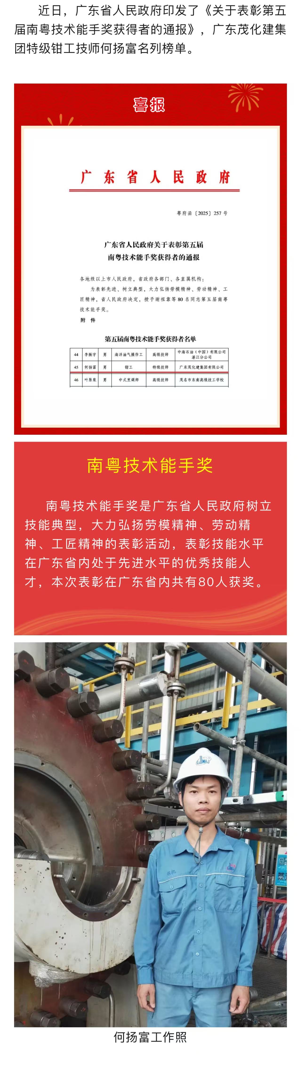 喜報 | 何揚富被授予第五屆“南粵技術能手獎”